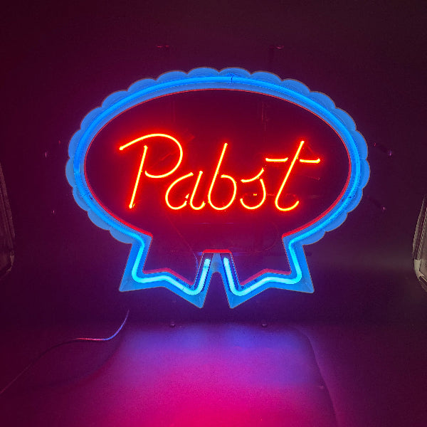 A classic and highly recognizable design, this Pabst Blue Ribbon clamshell neon sign features the vintage red, white, and blue Pabst logo housed in a rounded shell frame. Perfect for bars, basements, or collectors looking to showcase a piece of iconic American beer history. Lights up beautifully and makes a bold statement in any space.